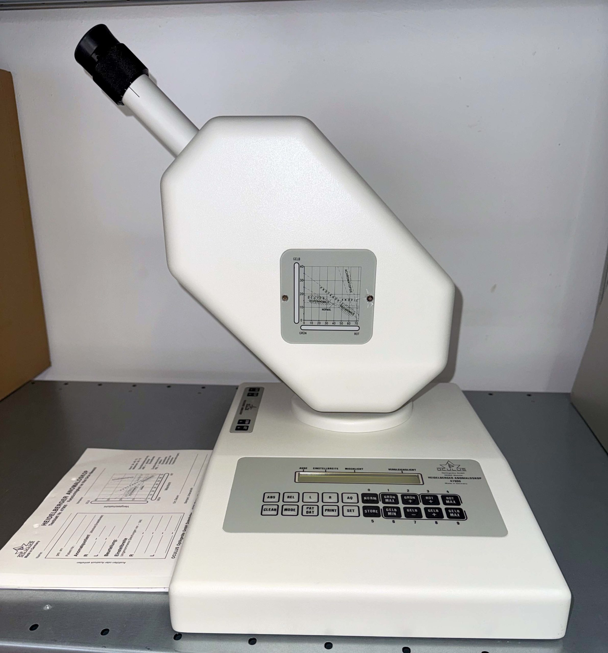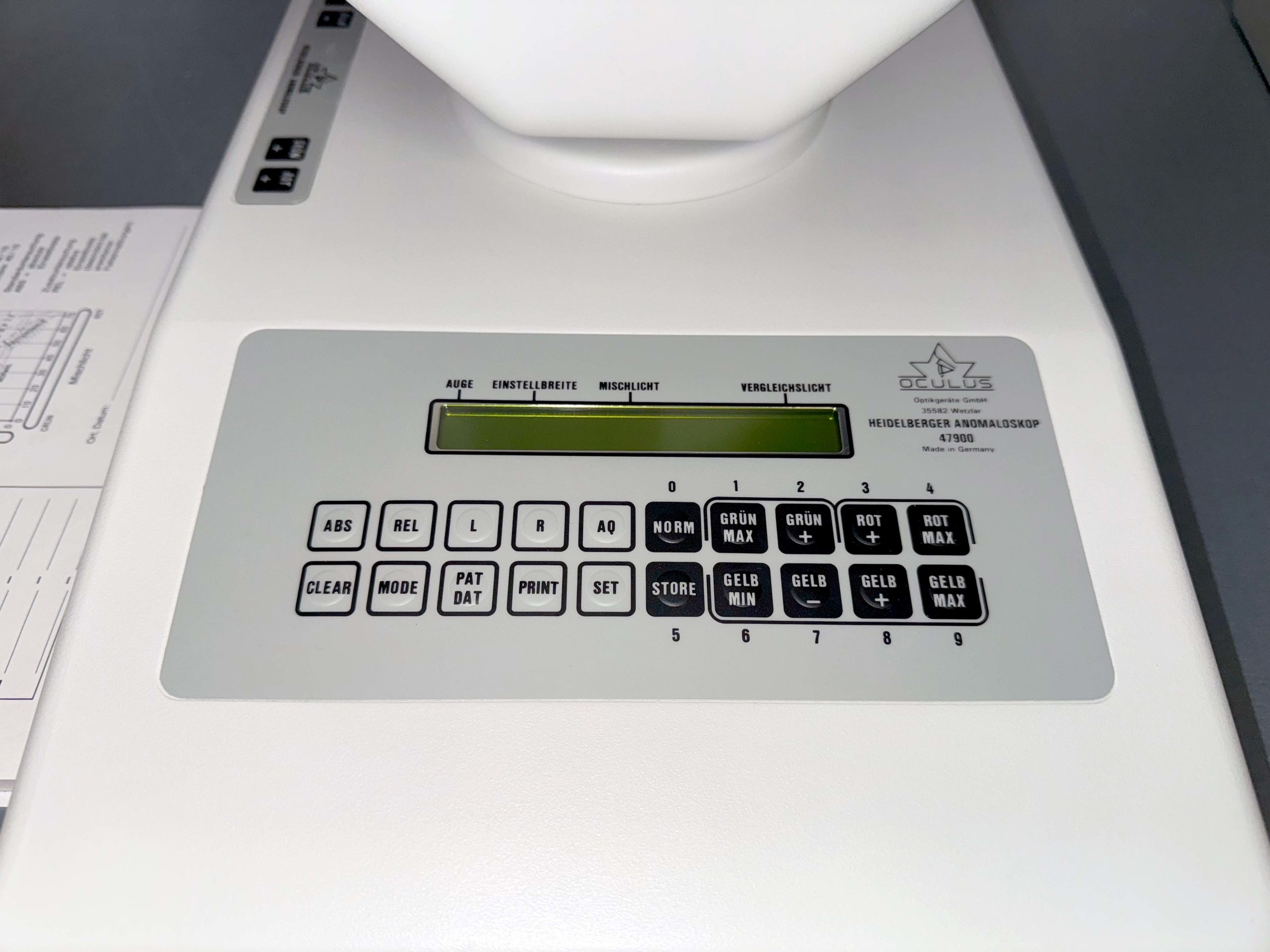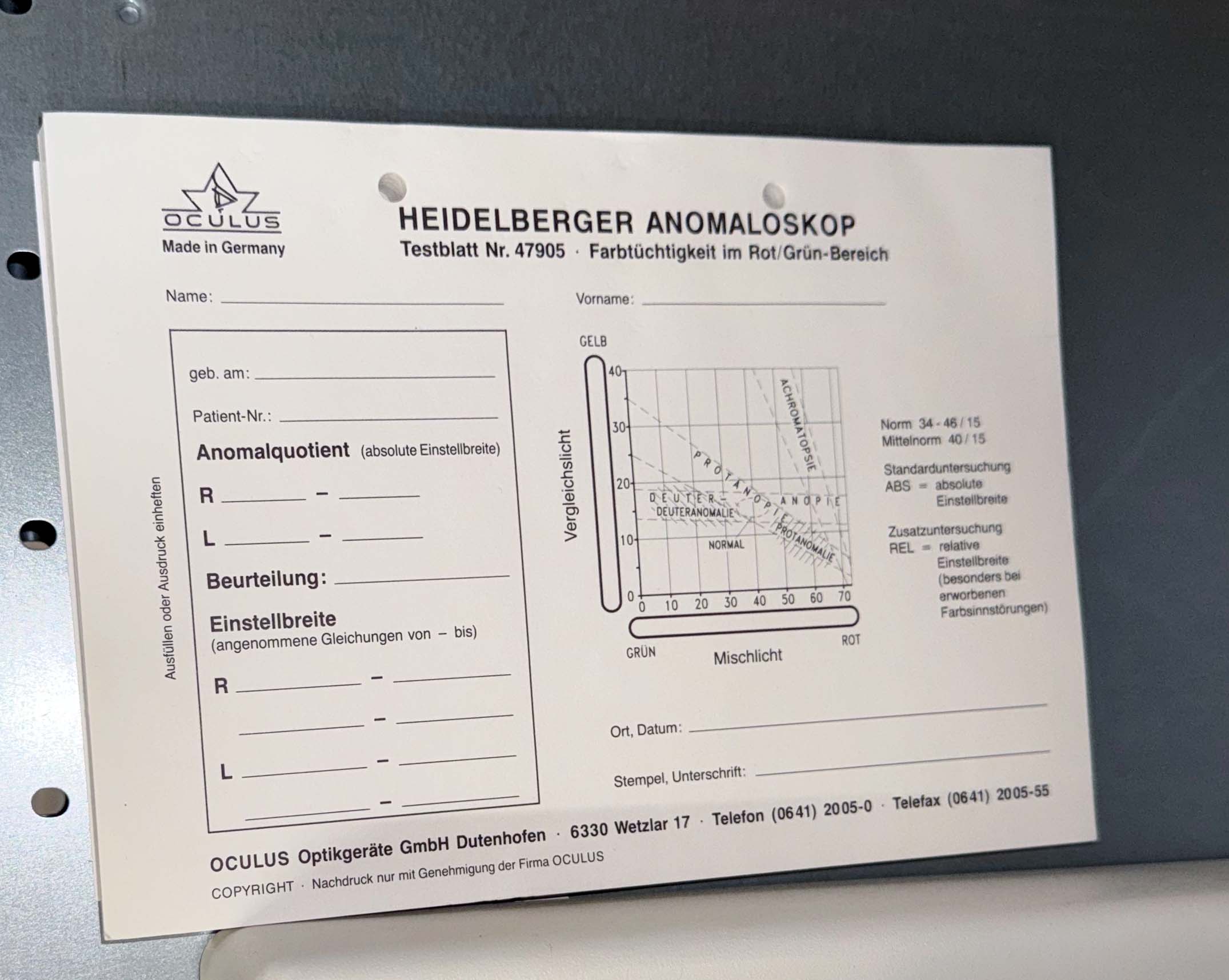 Dispositivo de análisis de color Anomaloscopio Oculus con hojas de prueba.
