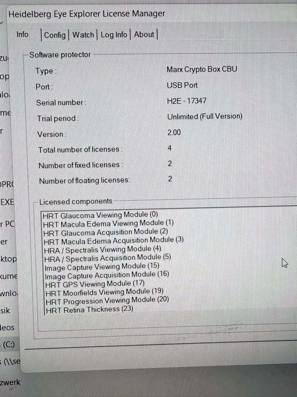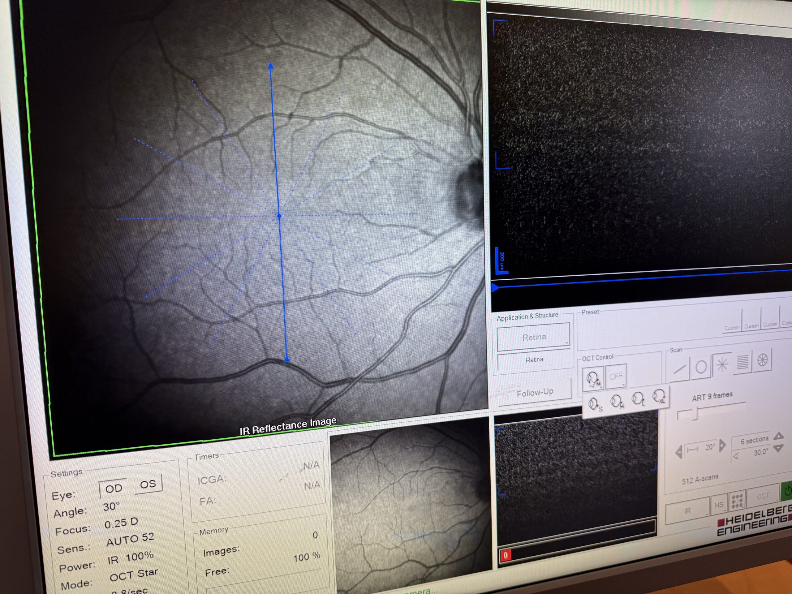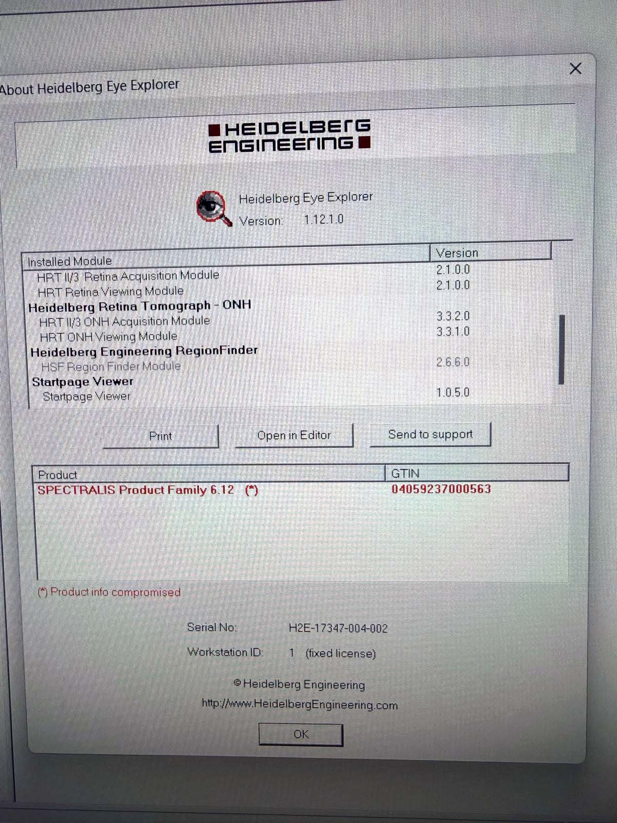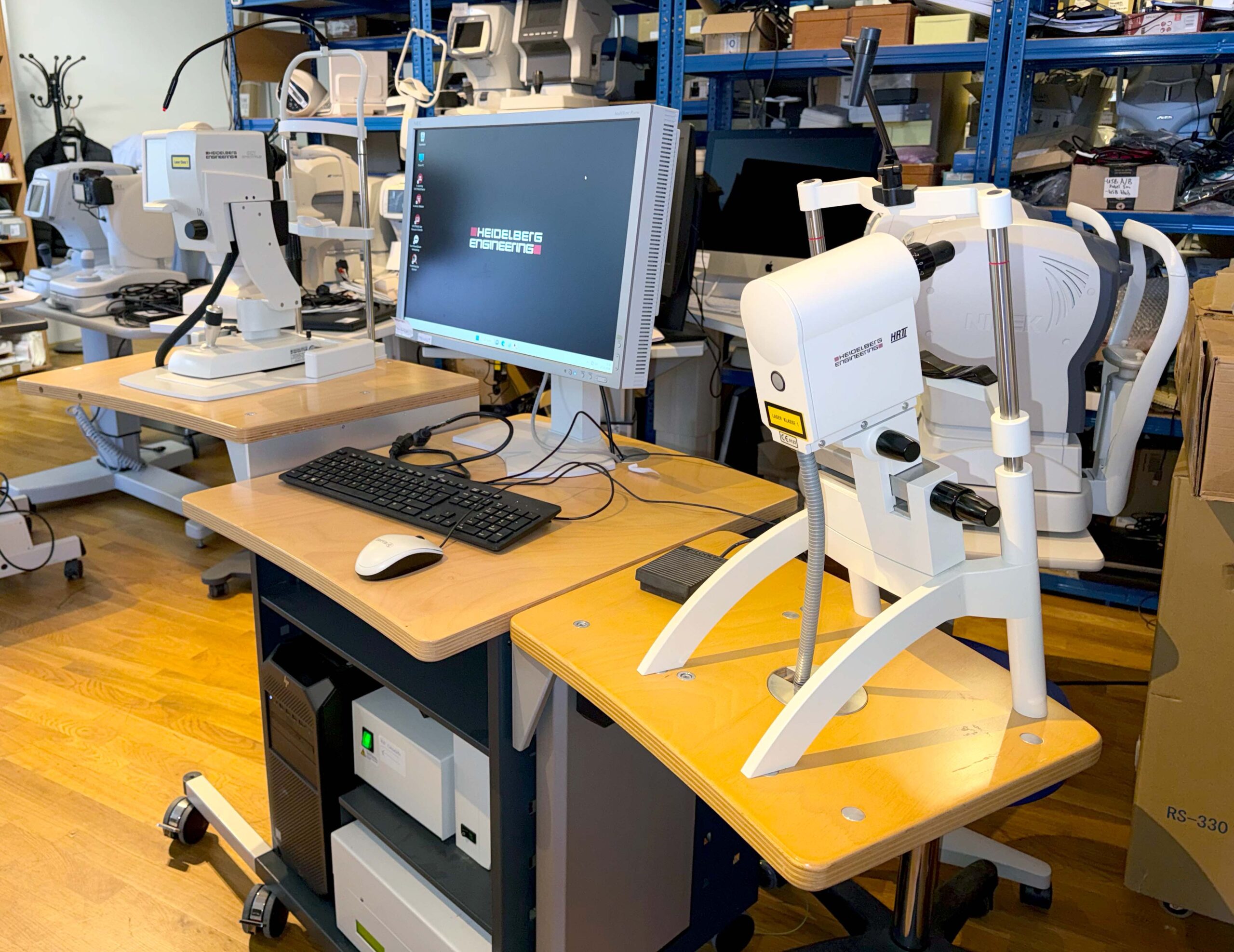 OCT Heidelberg Spectralis 2012, con módulos de gran angular y anterior (2012), y Heidelberg Eng. HRT II 2001, con módulos para glaucoma y retina. Software Spectralis versión 7. PC con Windows 11, con software integrado para el funcionamiento del HRT II y el OCT. Mesa elevadora original con mesas elevadoras independientes a izquierda y derecha. Revisado por Heidelberg Engineering.