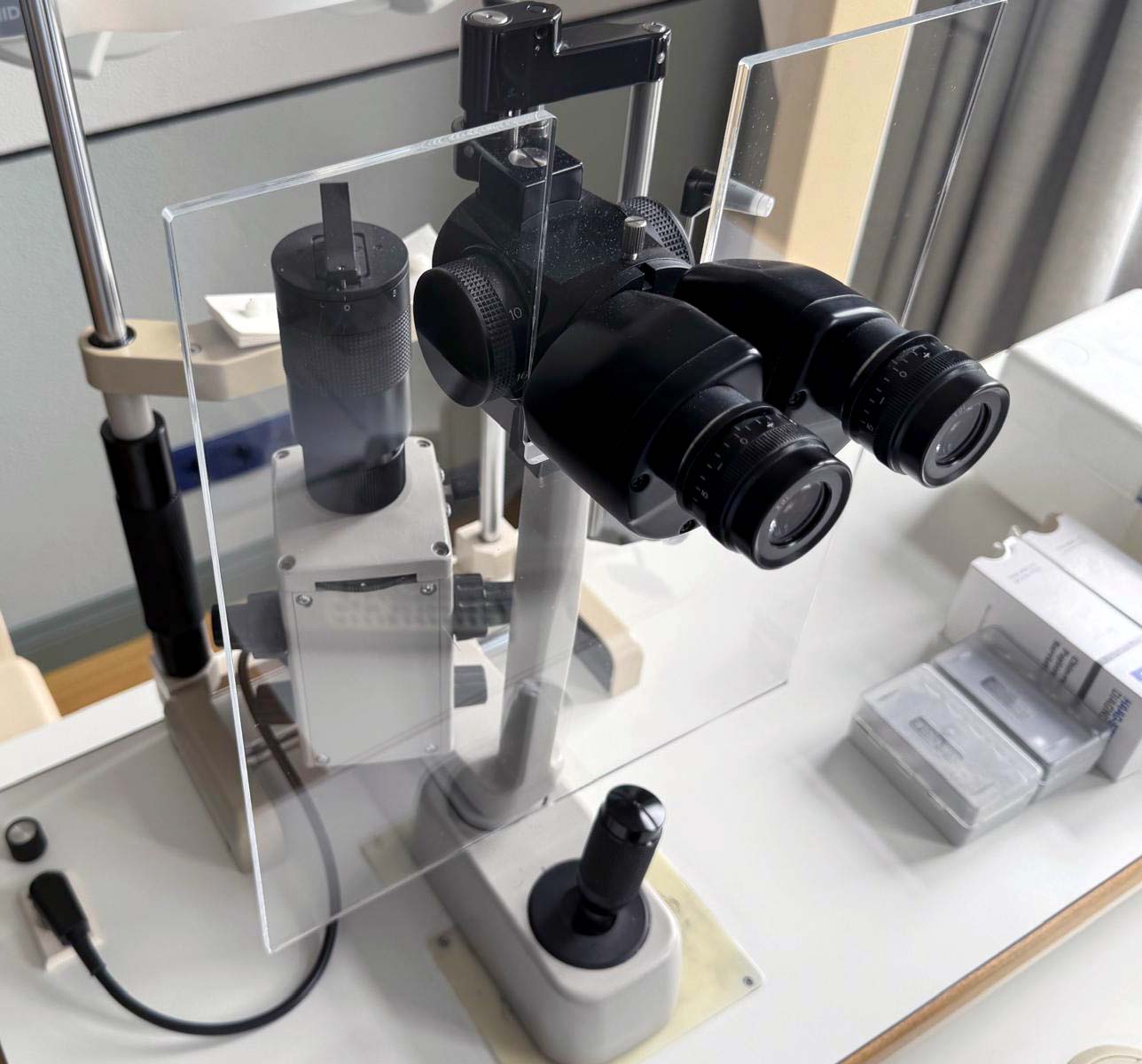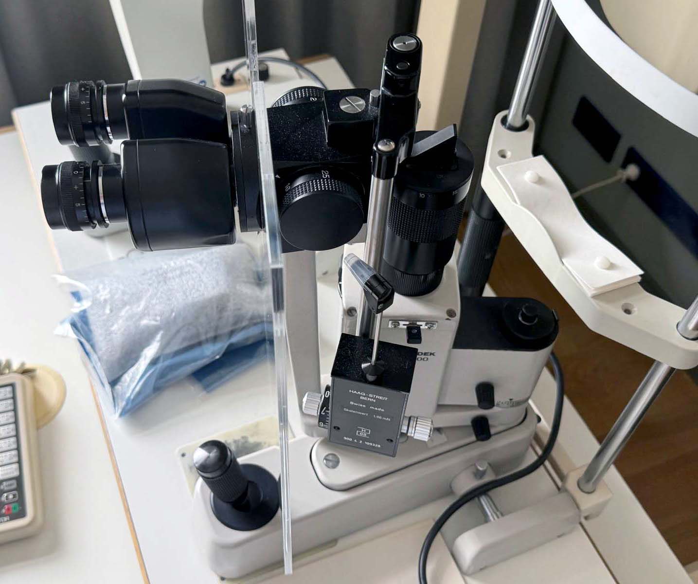 Incluye: Tonómetro de aplanación Haag Streit. Óptica Galilei. Cambiador de aumentos de 5x. Ajustes: 6x, 10x, 16x, 25x y 40x. Lámpara halógena de 6 V y 20 W.