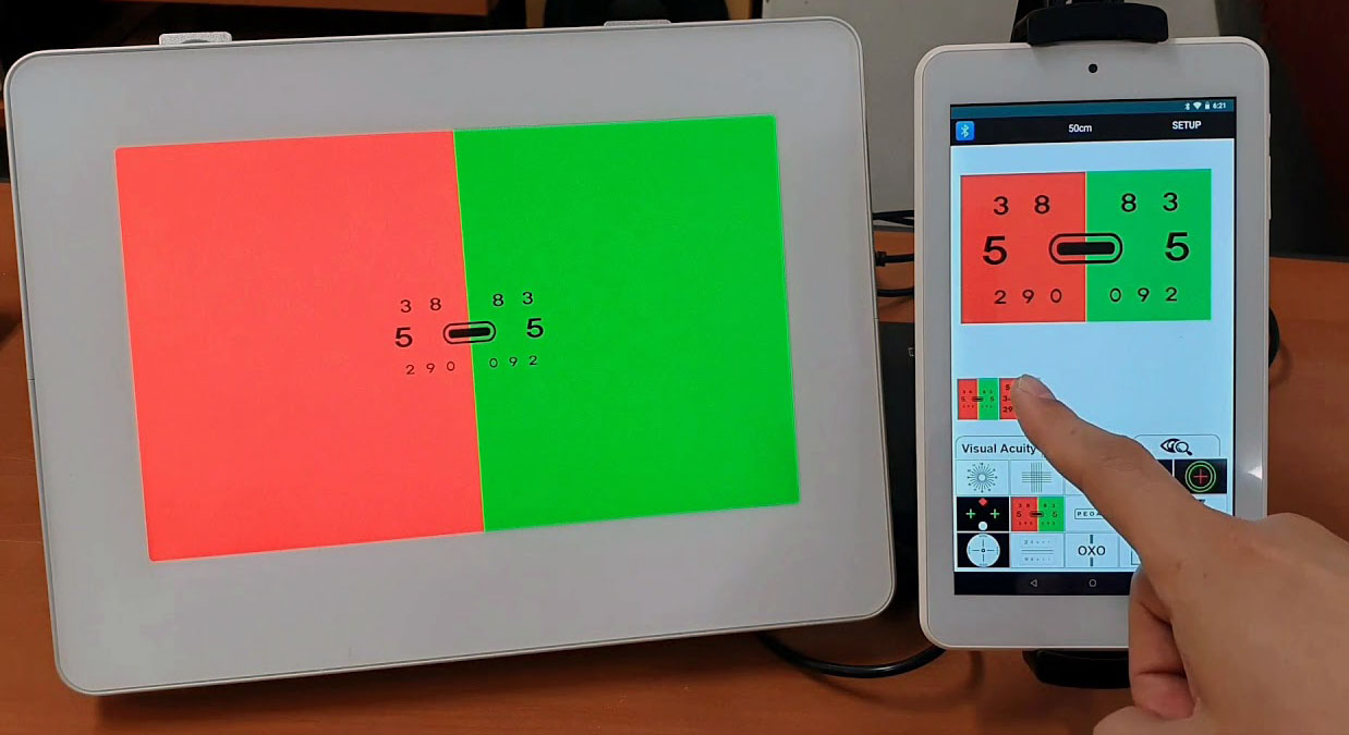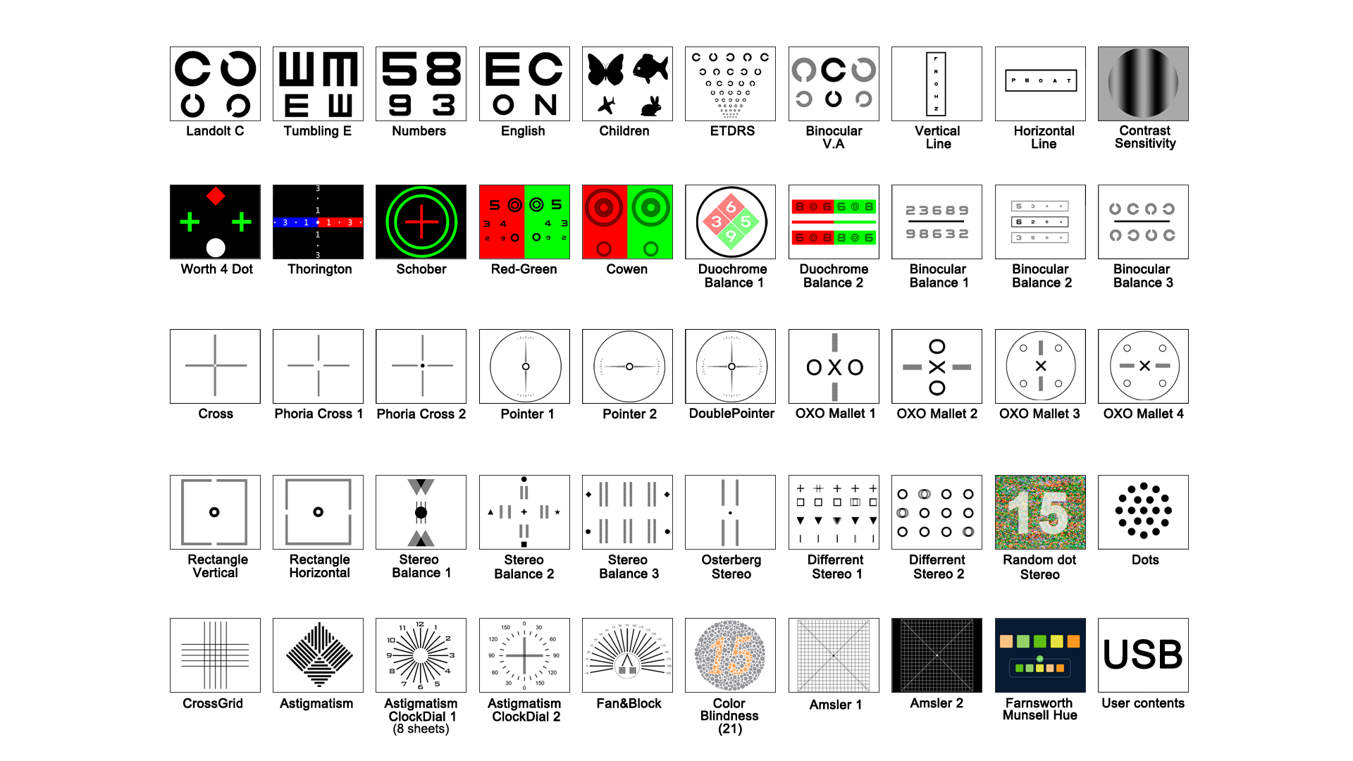 Tipo de conexión: Refractores forópteros Nidek/Huvitz/Topcon. Pantalla panorámica Full HD de 24 pulgadas con polarización circular. Incluye control remoto (tableta opcional: +390 €). Optotipos: Rojo-Verde, E-hook, Landolt-C, Imágenes infantiles. Fabricado en Corea del Sur con certificaciones CE, FC, KFDA e ISO.